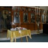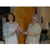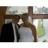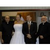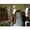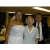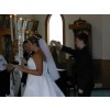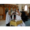 Crowned Here is a picture of us (from behind) with our crowns. |  Dance around the table Part of the wedding ceremony is when the bride and groom dance around the table. In reality, it is more like stumbling around the table, because we each had a candle in our left hand, and we were holding our right hands, and our heads were attached with the ribbon between the crowns. Plus Beth's dress is the size of Texas ;) |  Around the table (again) Here is another shot of us going around the table. |  Flowers Greg putting flowers on Beth's wrist |  At the church Here is a picture of us at the church. The only reason Beth was standing there was because there was an A/C vent on the floor, and you can probably imagine how hot it gets in that dress. |  The Table Here is a picture of the table at the church. |  Wine Here is Beth drinking the wine. The wine is supposed to represent "taking the sweet as well as the bitter." The wine was a little too sweet for Beth I think ;) |  Us with Yia Yia Here we are with my yiayia. |  Us with the priests Here we are with the two priests who officiated at the service. Father Chris is on the right. Father Frank is on the left. Father Frank is my Godfather. |  Beth pretending to be upset Here is a cute picture of Beth shaking her finger at someone. |  The Bunt Its a Cake!